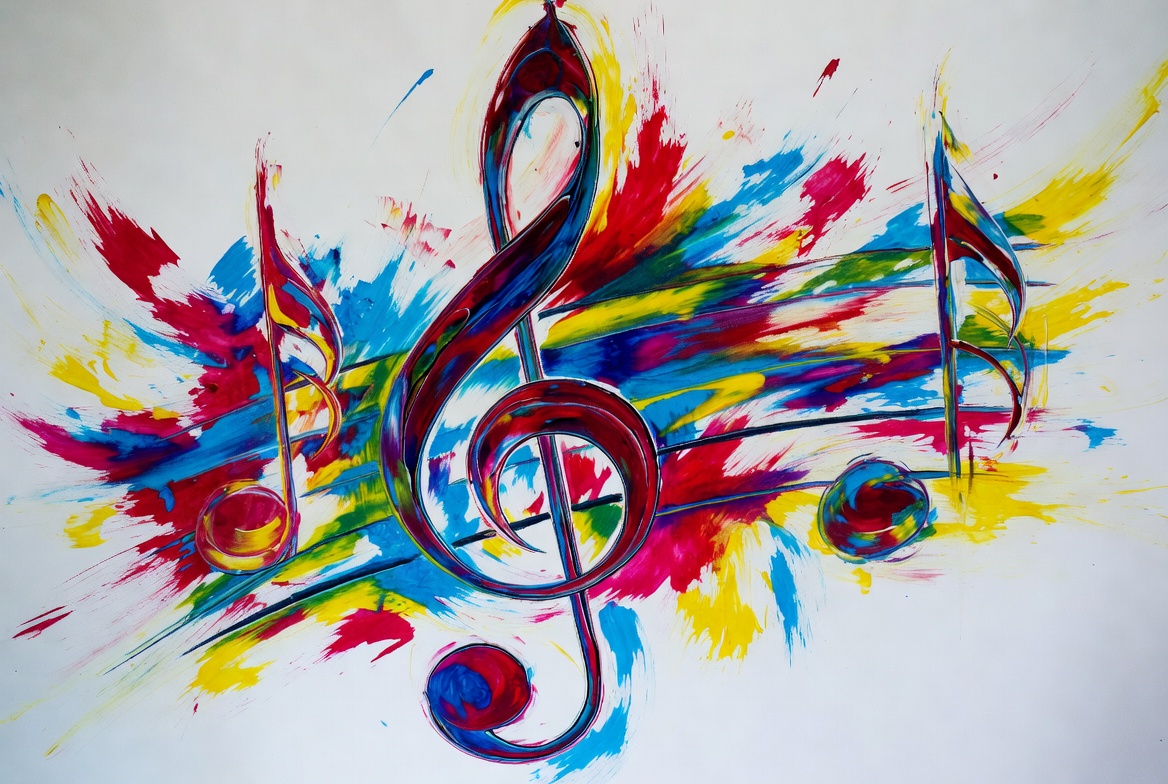 abstract art, artistic music, blue paint, clef symbol, colorful splatter, dynamic notes, illustration, music art, musical symbols, notes design, paint splashes, purple paint, rainbow colors, red paint, splash painting, treble clef, vibrant colors, white background, yellow paint, music notes