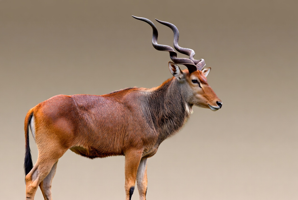 African antelope, animal, antelope, beige background, gray fur, horns, isolated, large horns, male kudu, mammal, nature, reddish brown fur, safari animal, side view, spiral horns, standing, wild animal, wildlife, kudu