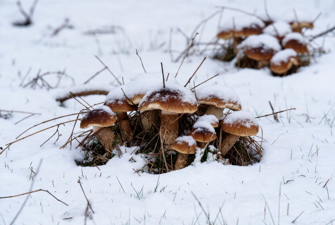 brown caps, brown mushrooms, cluster, cold weather, forest floor, frost, fungi, grass, macro, mushroom cluster, nature, outdoors, snow, snow-covered, snowy ground, white snow, wild mushrooms, winter, winter landscape, mushrooms