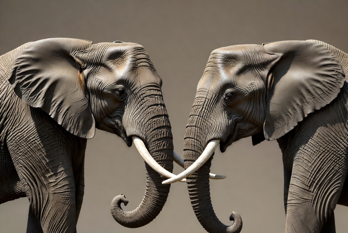 Two realistic elephants face each other with trunks intertwined and touching. Their long tusks curve upward, and detailed skin textures are visible on a plain neutral background. The image highlights their large ears and expressive eyes.