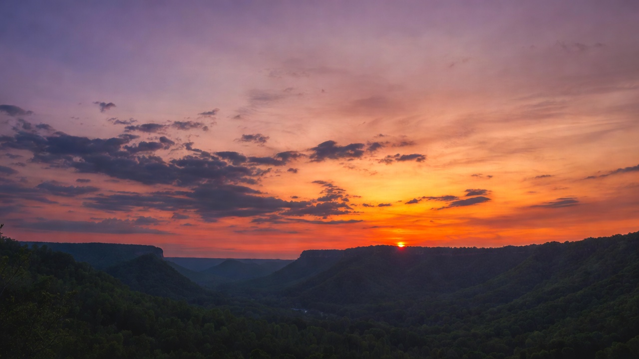 canyon, cliffs, clouds, dramatic sky, forest, green trees, landscape, low sun, nature, orange sky, outdoors, pink sky, purple sky, rugged cliffs, scenery, sky, sun, valley, vibrant colors, sunset