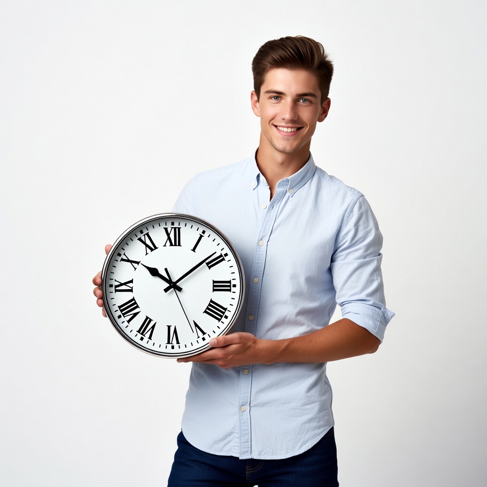 Roman numerals, White, analog clock, brown hair, button-up shirt, holding clock, jeans, large clock, light blue shirt, male, portrait, rolled sleeves, smiling, studio photo, time, watch, white background, white clock, young man, man