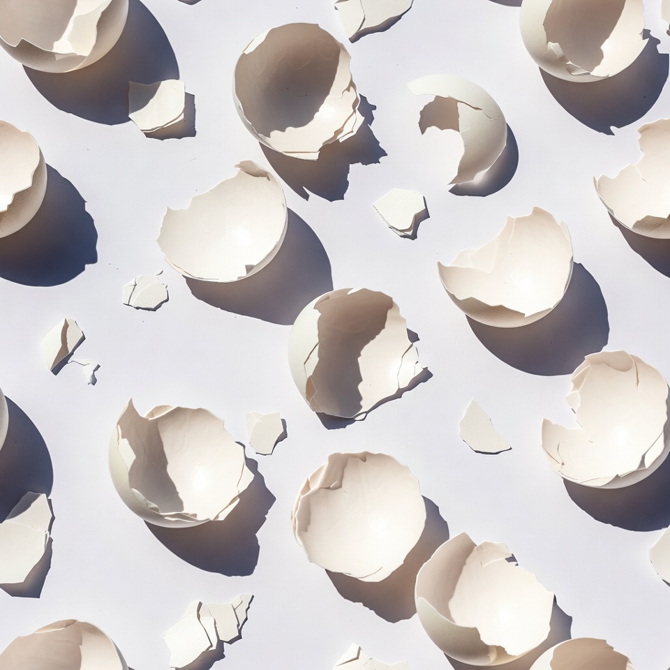 Numerous broken eggshells are scattered across a plain white surface. The eggshells show jagged cracks and fragments with soft shadows highlighting their curves. The composition creates a repetitive pattern of white eggshell pieces.