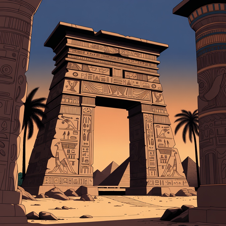 Egyptian architecture, ancient Egypt, ancient gate, carvings, columns, desert, hieroglyphs, historical illustration, illustration, isolated background, line art, obelisk, palm trees, pyramids, sand dunes, stone archway, sunset, vector art, Egyptian temple