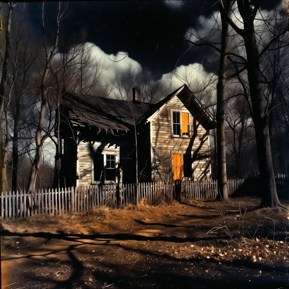 atmospheric scene, autumn leaves, bare trees, barren landscape, creepy forest, dark forest, decayed fence, dilapidated building, eerie atmosphere, foggy night, ghostly light, haunted house, horror house, isolated house, mysterious building, night scene, noir style, old house, orange window, picket fence, rundown home, rural decay, shadowy trees, spooky house, twilight woods, vintage photo, wooden house, woodland cabin, abandoned house