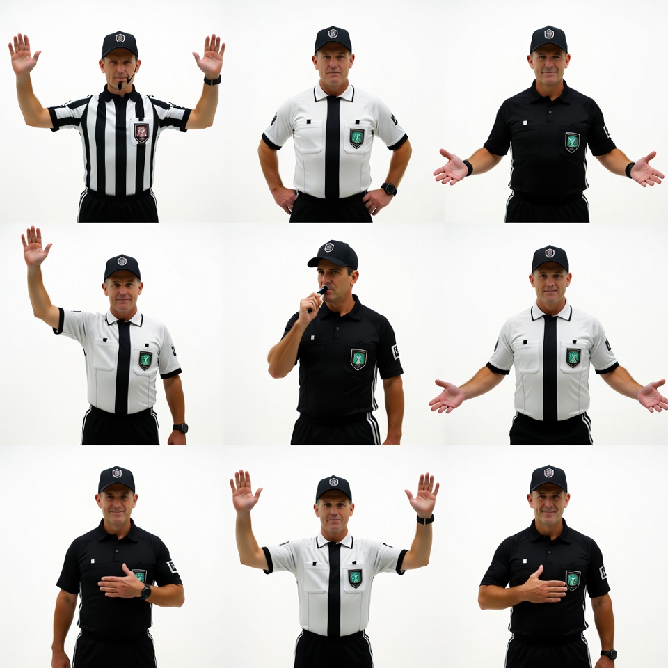 White, athletic man, black white uniform, football referee, green emblem, grid images, hand gestures, isolated background, man, referee cap, referee poses, referee signals, shrugging shoulders, soccer referee, sports official, sports uniform, striped jersey, waving hands, whistle, white background, referee