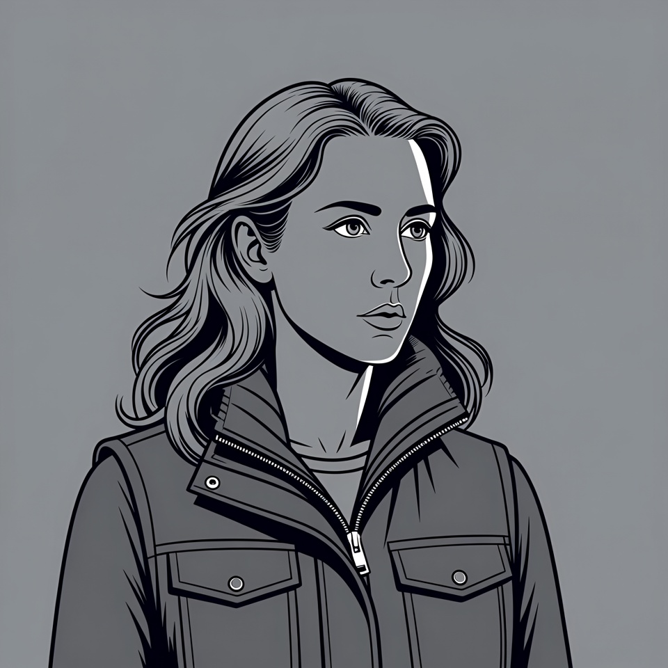 A line art illustration of a woman with long wavy hair turned in profile. She wears a zipped jacket with pockets and collar over a shirt. The image is rendered in black and white on a gray background.
