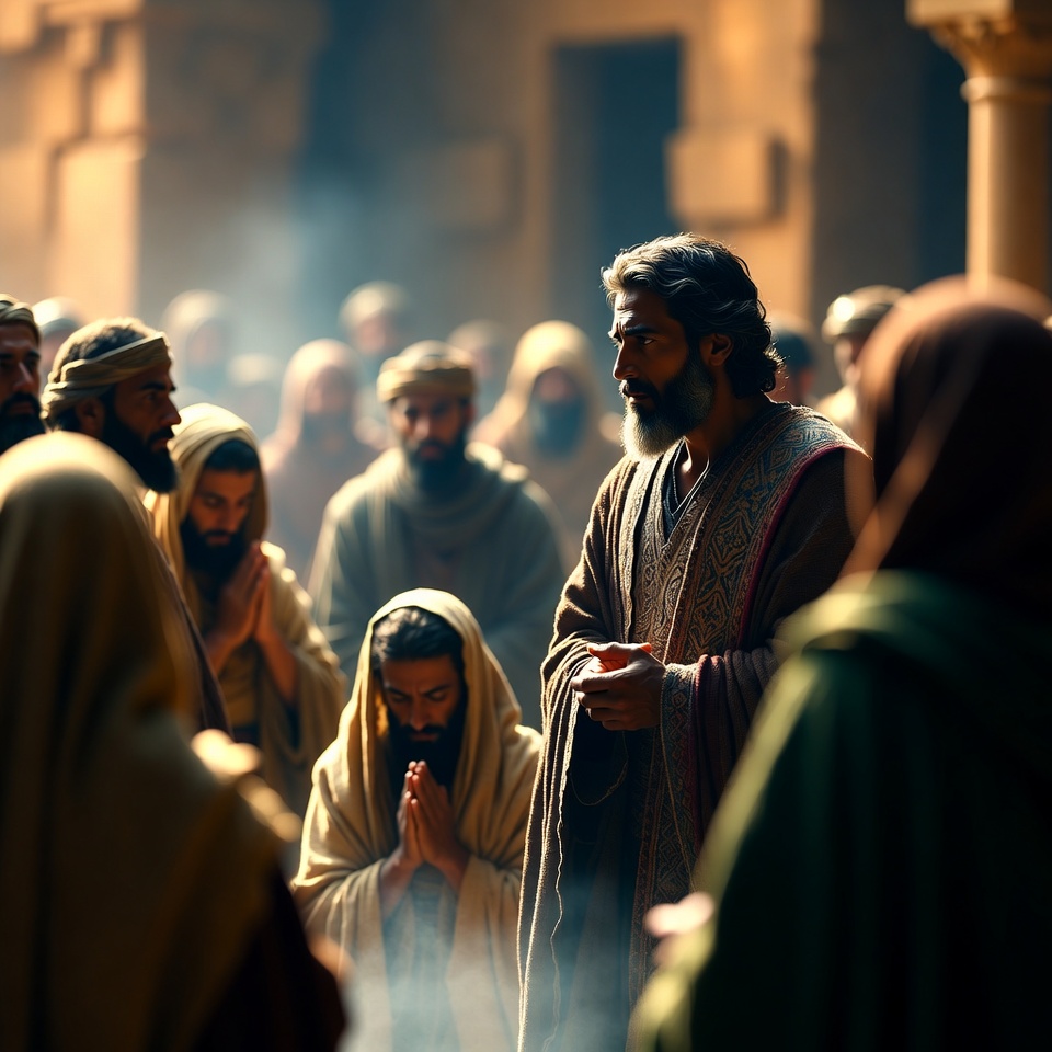 Middle Eastern, ancient, beard, biblical, courtyard, crowd, disciples, faith, fog, gesturing, golden light, group, head coverings, historical, listeners, long hair, men, praying, robes, sermon, stone architecture, teaching, temple, women, Jesus