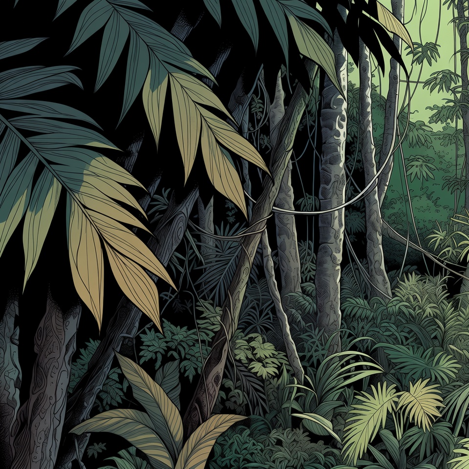 A detailed illustration depicts a dense jungle scene with tall trees, thick vines, and large green leaves in various shades. Ferns and foliage fill the foreground, creating a tropical forest atmosphere. The artwork features intricate line work and vibrant green tones on an isolated background.