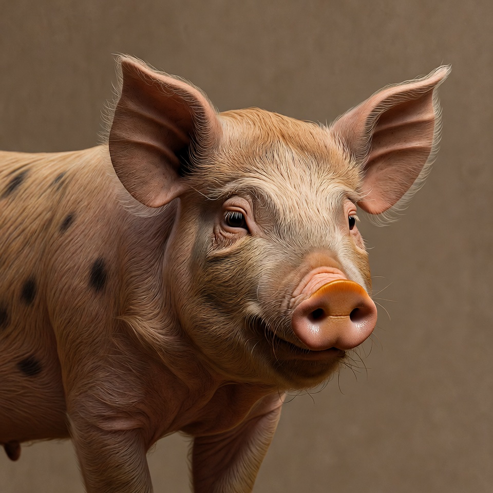 A realistic illustration of a young pink piglet with black spots stands facing forward on a plain brown background. It has large floppy ears, a pink snout, and expressive eyes. The piglet appears friendly with a slight smile.
