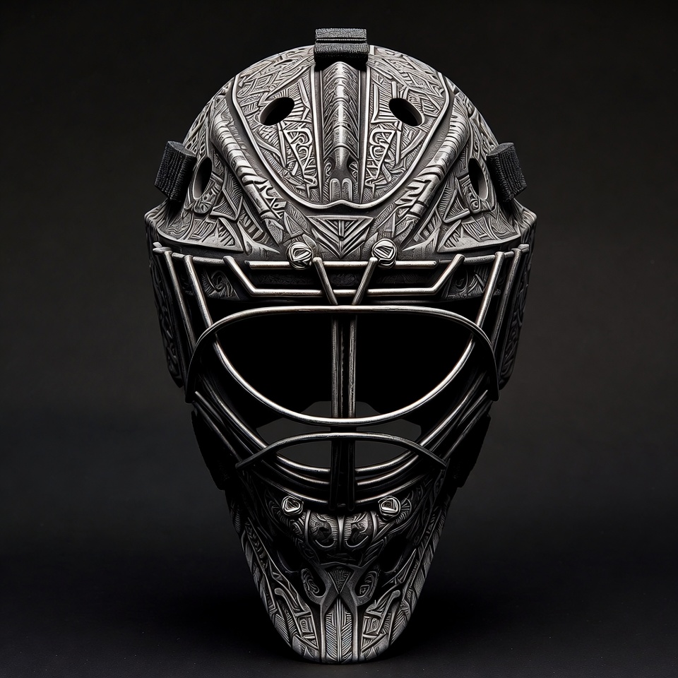 black background, detailed engraving, engraved design, goalie equipment, goalie helmet, goalie mask, hockey gear, ice hockey, metallic mask, protective mask, sports gear, tribal patterns, ventilation holes, wire cage, hockey mask