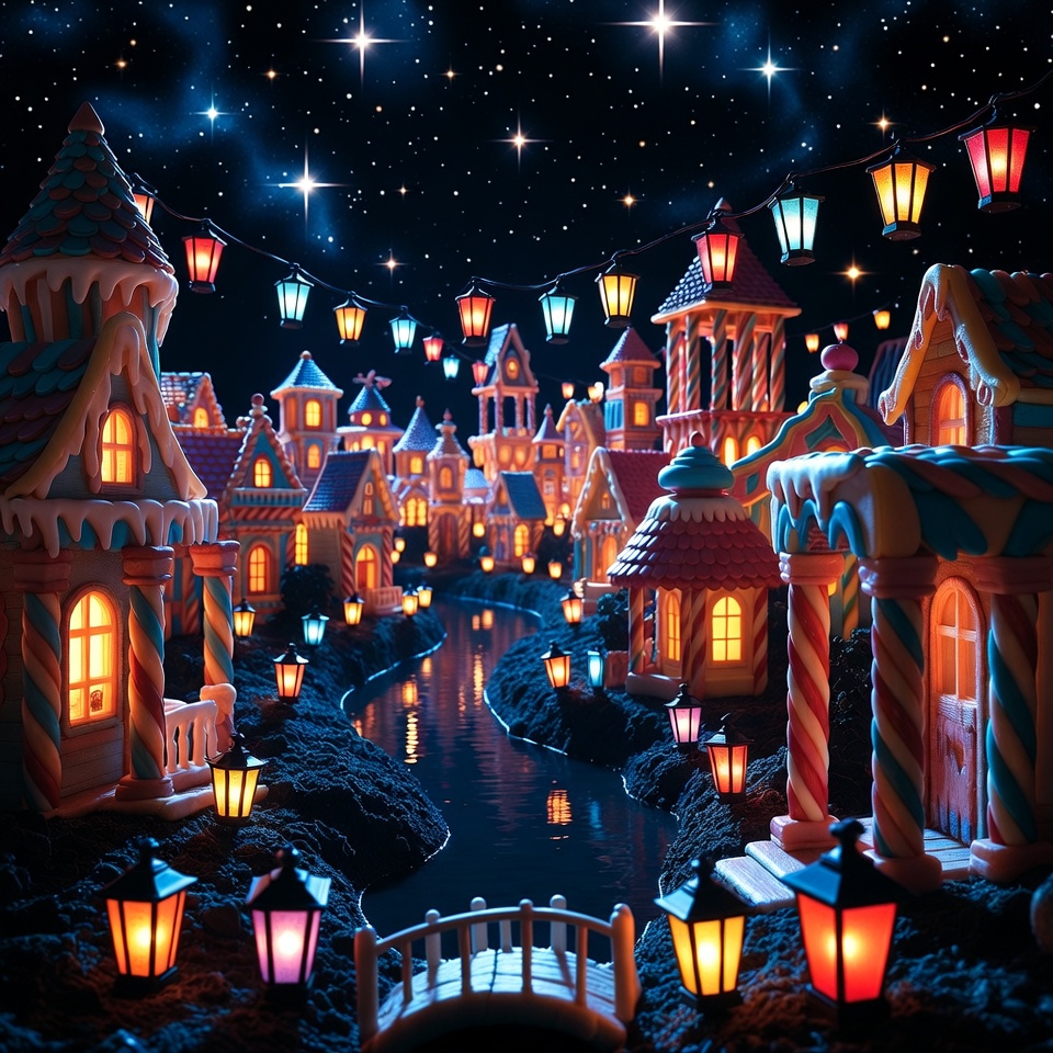 Christmas village, bridge, candy canes, candy houses, colorful lights, digital art, fairy lights, fantasy town, gingerbread houses, glowing windows, holiday scene, icing details, illustration, lanterns, night sky, peaked roofs, stars, stream, water reflection, whimsical village, gingerbread village