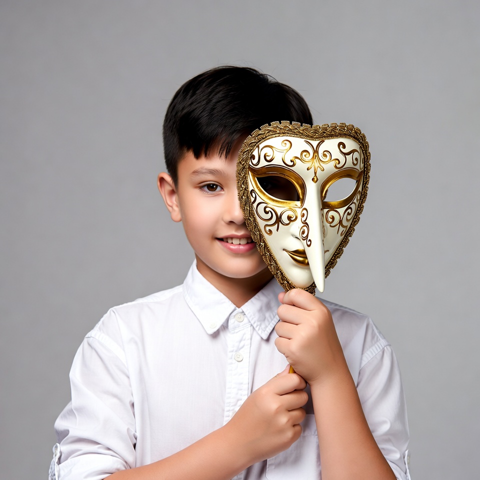 A young Asian boy with short black hair smiles while holding a white and gold Venetian-style mask in front of his face. He wears a white collared shirt and stands against a plain gray background. The mask features intricate gold filigree designs and a protruding nose.