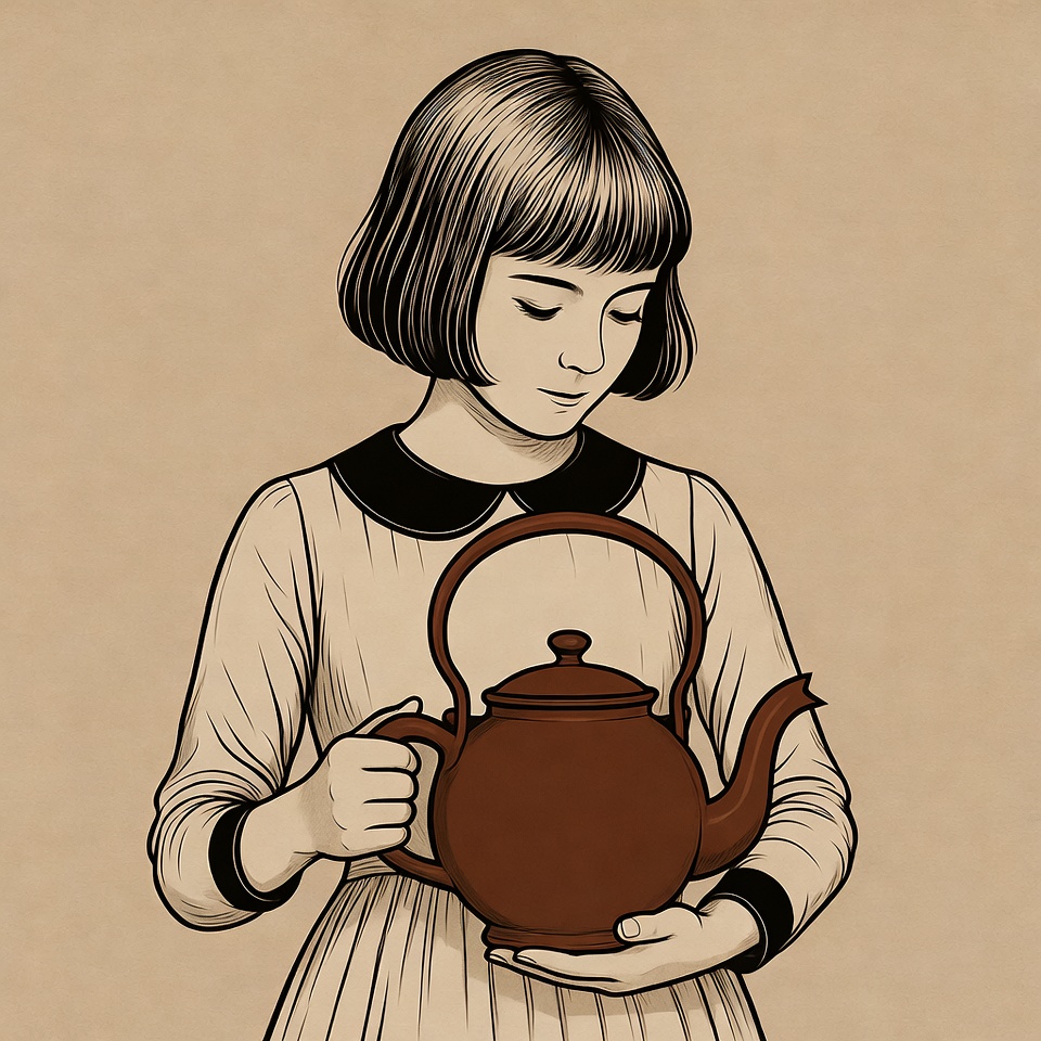 A young girl with a bob haircut and vintage dress with black collar holds a brown teapot with both hands. The illustration features clean line art on a beige background. She stands frontally with a gentle expression.