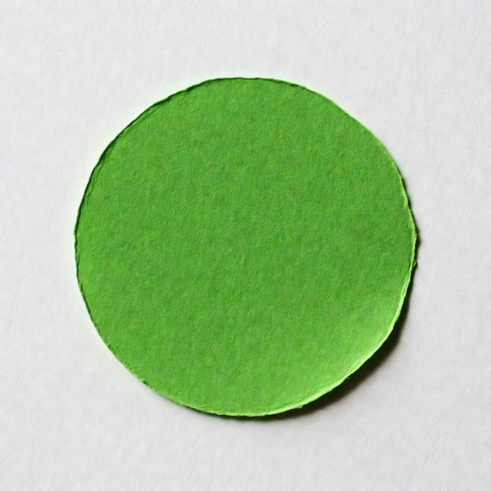 A vibrant green circular piece of paper with a slightly textured surface and irregular cut edges. It is centered on a plain white background, isolated for clear visibility.