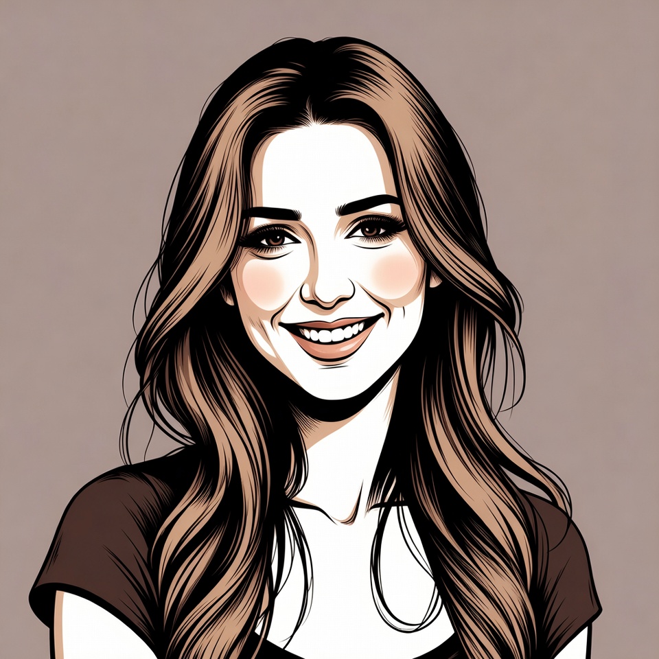 An illustration of a young woman with long wavy brown hair smiling warmly at the viewer. She has fair skin, rosy cheeks, and wears a maroon sleeveless top. The portrait is rendered in a stylized line art with a solid beige background.