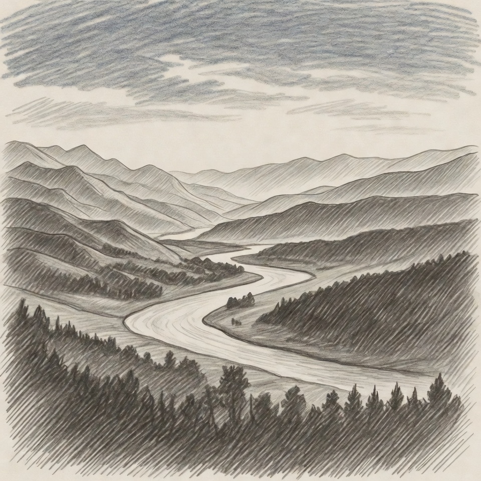 A detailed pencil sketch depicts a winding river flowing through a vast valley surrounded by layered mountains. Dense forests of trees line the riverbanks, with a cloudy sky overhead. The artwork uses shading to create depth and texture in the natural landscape.