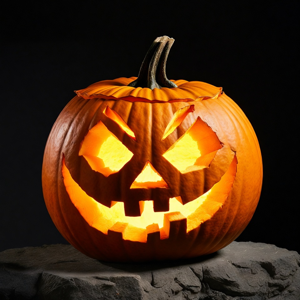 Lit Jack-o'-lantern on rock