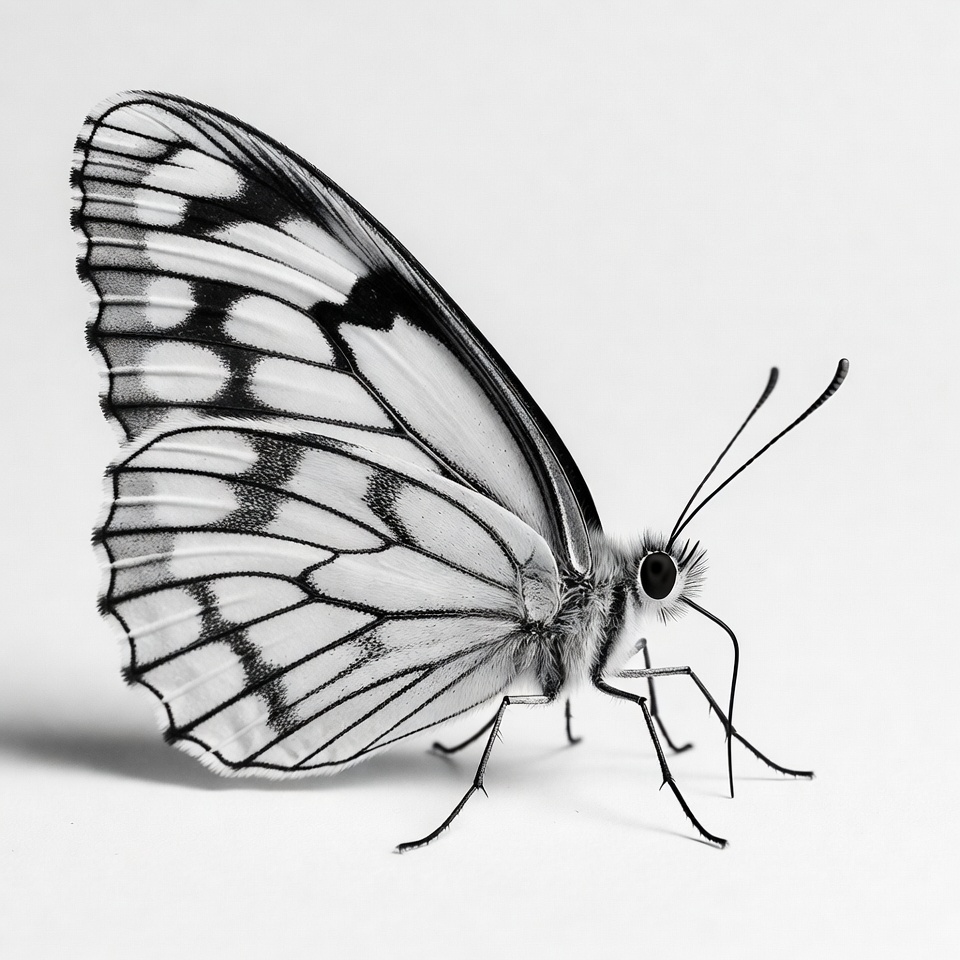 A detailed white butterfly with intricate black patterns on its wings is posed against a plain white background. The wings feature delicate veining and scalloped edges. Its antennae are curved and the body is fuzzy.