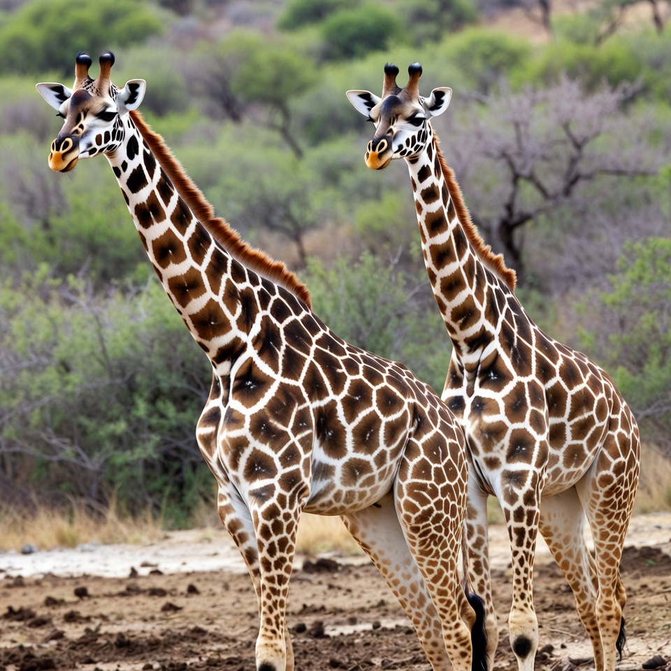 Africa, African animals, acacia trees, animals, bush, dry plain, herbivores, horns, long legs, nature, outdoors, safari, savanna, spots, standing giraffes, tall necks, two giraffes, wild animals, wildlife, giraffes