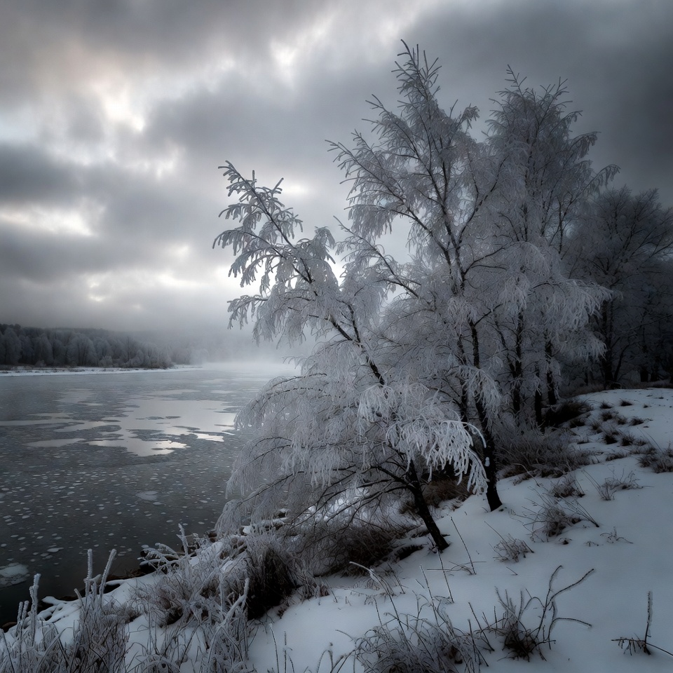 atmospheric, bare trees, cloudy sky, cold weather, frost, frozen branches, gray clouds, ice patches, icy river, mist, nature, riverbank, serene landscape, snow covered, snowy bank, snowy landscape, white trees, winter nature, winter scene, frosty trees