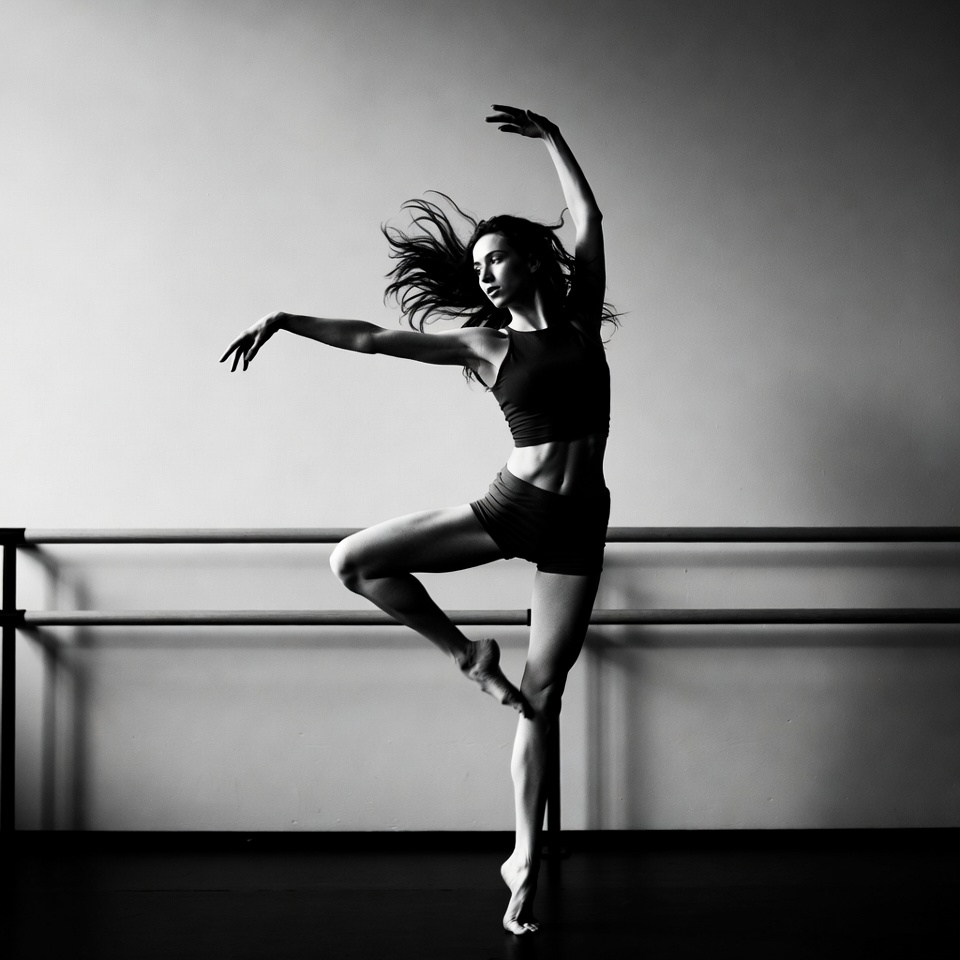 A woman with long flowing hair strikes a dynamic ballet pose next to a barre in a studio. She wears a black tank top and shorts, with one leg extended high and arms gracefully arched. The black and white photograph captures her on a dark floor against a light background.