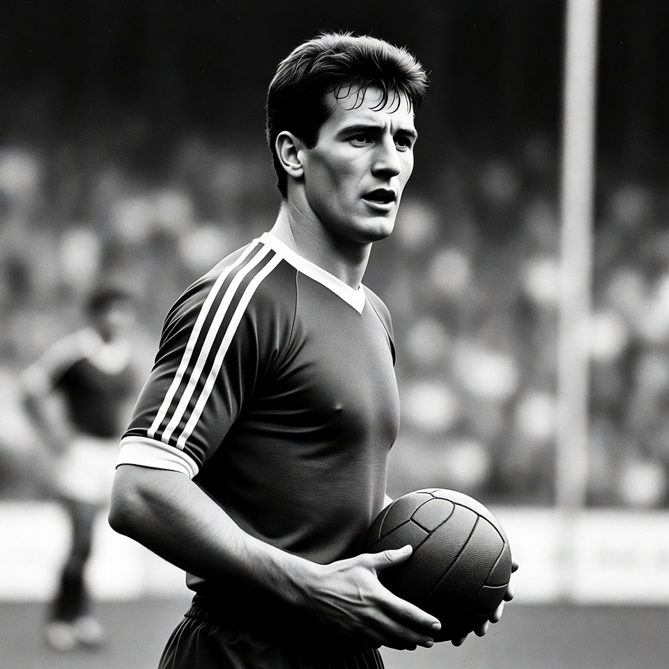 1970s soccer, Adidas jersey, White, action pose, athletic man, black white photo, crowd, football, footballer, goalpost, holding ball, man, shorts, soccer ball, soccer jersey, soccer uniform, sports field, stadium, vintage soccer, young man, soccer player