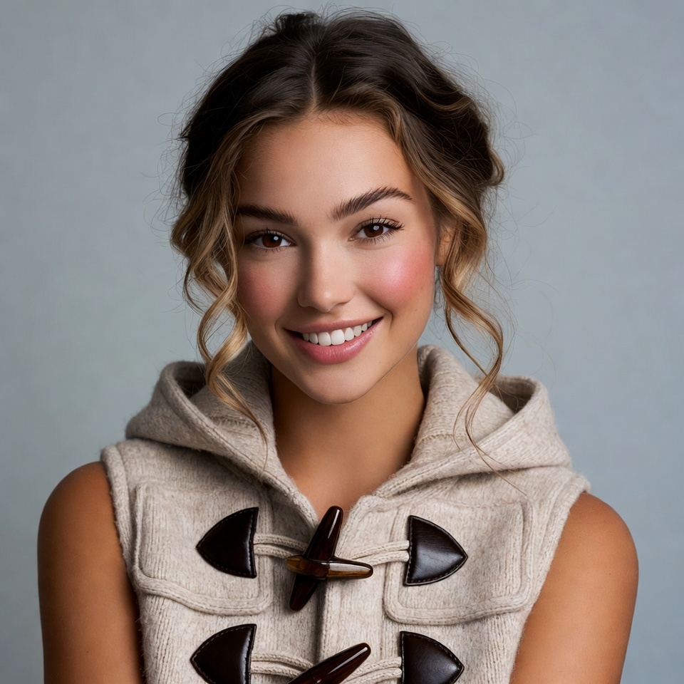 A young woman with wavy brown hair styled in an updo smiles warmly at the camera. She wears a sleeveless beige hoodie with a hood and brown toggles. The image features a plain light blue background.