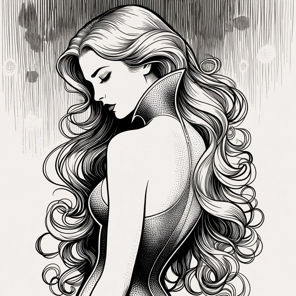 A detailed black and white ink illustration depicts a woman in profile view with long flowing wavy hair cascading down her back. She wears a high-collared sleeveless dress that accentuates her figure, set against a dark textured background with ink splatters. Her expression is serene with closed eyes and subtle facial features.