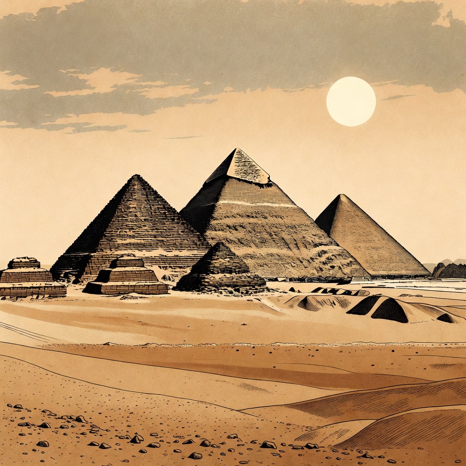 An illustration depicts the ancient Giza pyramids rising from the sandy desert under a large full moon. The three main pyramids stand prominently with smaller structures nearby, surrounded by dunes and a cloudy sky. The artwork uses soft beige and brown tones with subtle line details.