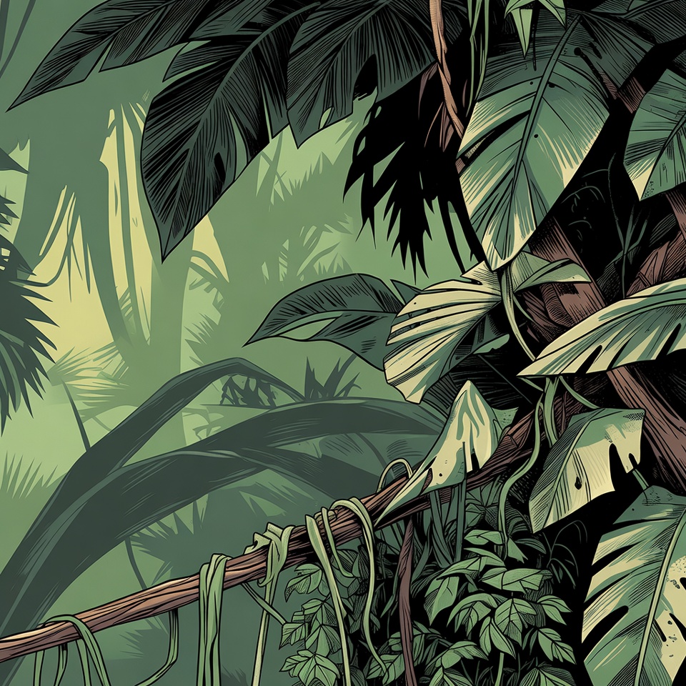A detailed black ink illustration depicts a dense tropical jungle with overlapping large green banana leaves and vines. Vines dangle from branches amid layered foliage in shades of green. The artwork features intricate line work on an isolated background.
