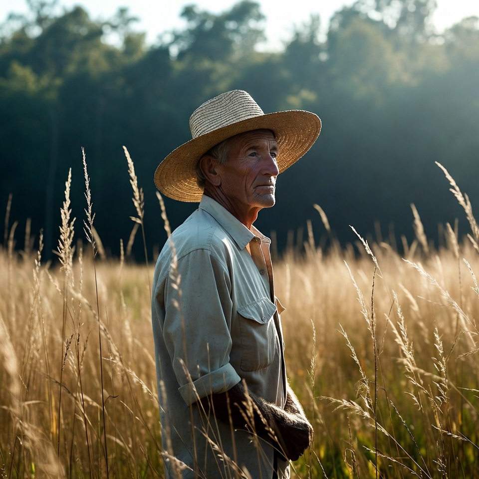 An elderly man with a straw hat stands in a tall grass field during golden hour sunlight. He wears a light beige shirt with rolled sleeves and leather gloves, gazing thoughtfully with hands clasped. The background features dense green trees and swaying pampas grass.