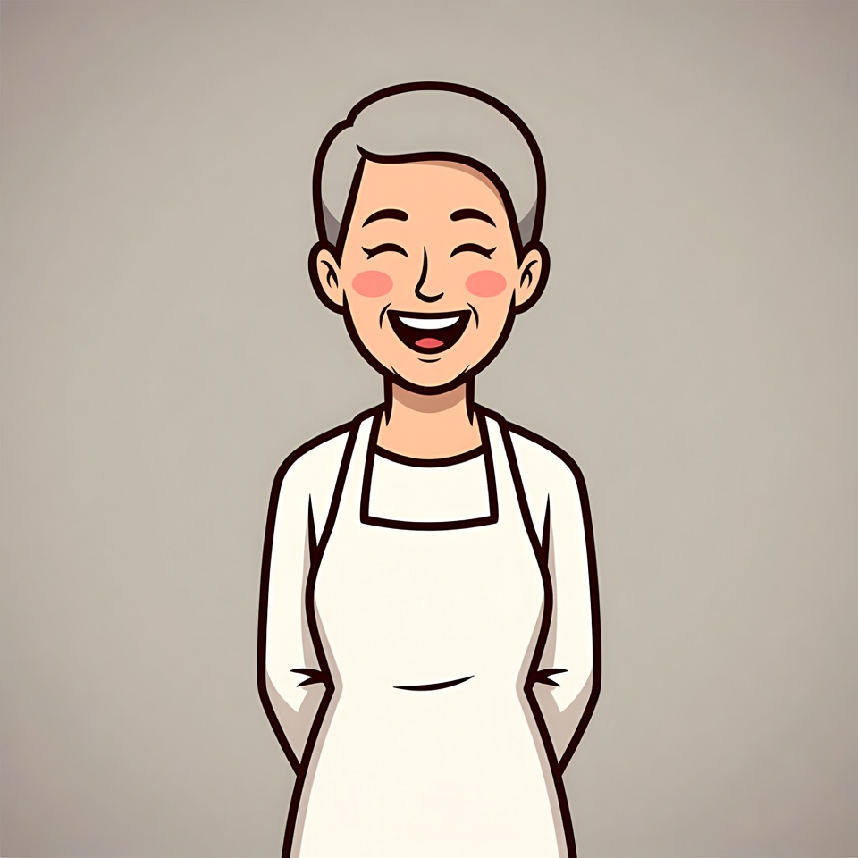 A cartoon illustration of an elderly Asian woman with short gray hair smiles happily with rosy cheeks. She wears a white apron over her clothes and stands with hands at her sides against a plain gray background. Her expression shows joy with squinted eyes and an open mouth.