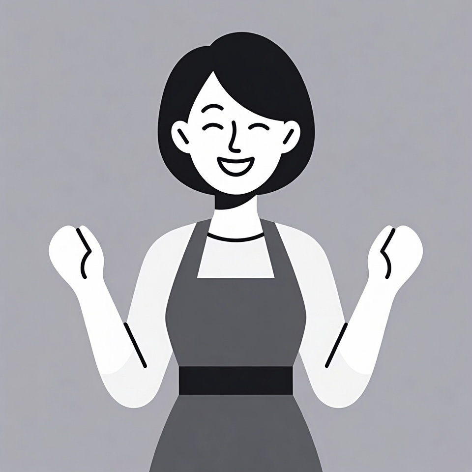 Asian, apron, arms up, black lines, cartoon woman, cheerful, clipart, excited, female, gray background, happy, illustration, joyful expression, line drawing, minimalist, raising arms, short hair, smiling, squinting eyes, triumph pose, vector art, woman