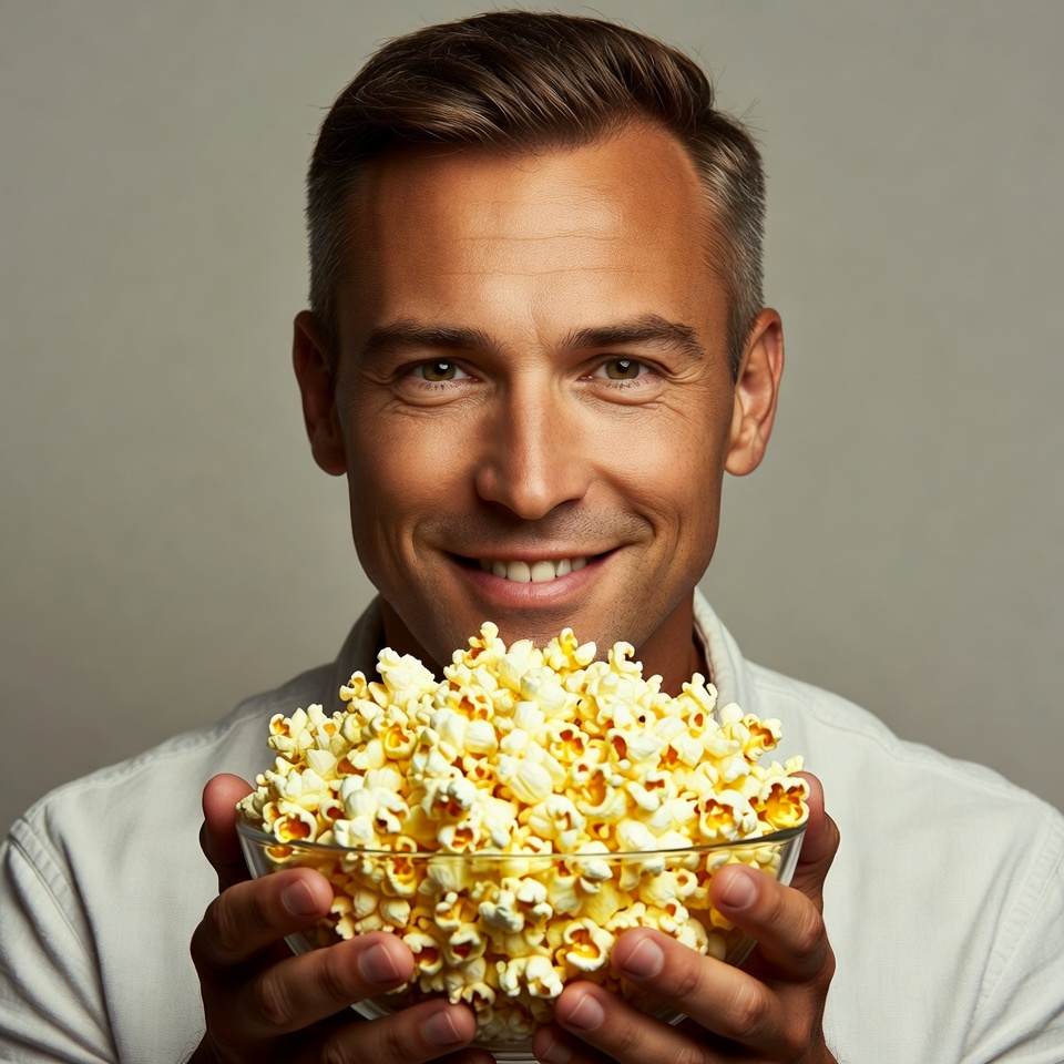 A smiling man with short brown hair holds a large glass bowl overflowing with yellow popcorn in front of him. He wears a white collared shirt and stands against a plain gray background. His eyes are focused forward with a cheerful expression.