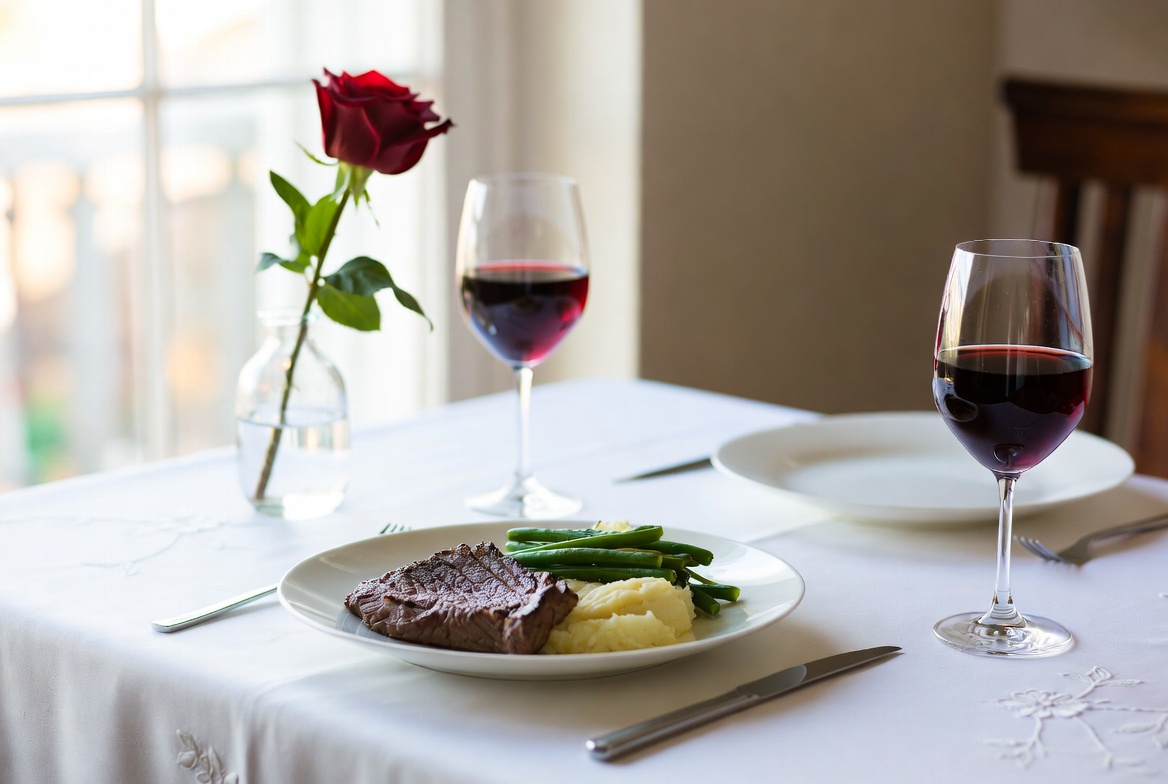Steak Dinner with Red Wine and Rose
