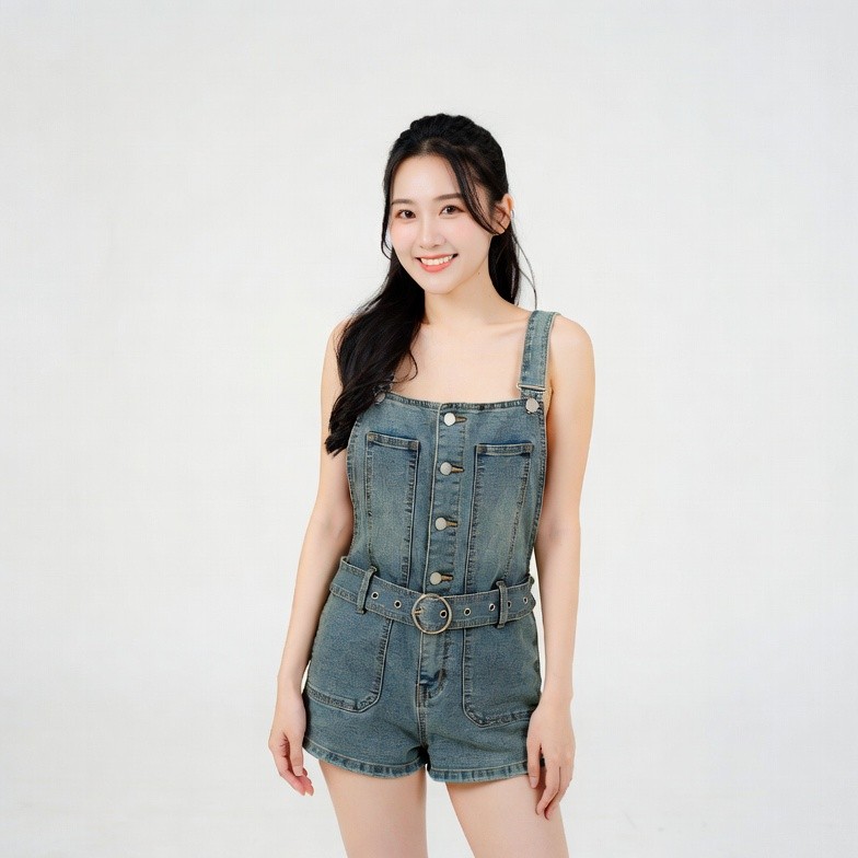 A young Asian woman with long dark hair tied in a ponytail stands smiling against a white background. She wears a sleeveless blue denim romper with buttons, straps, and a large belt buckle. Her pose is relaxed with hands at her sides.