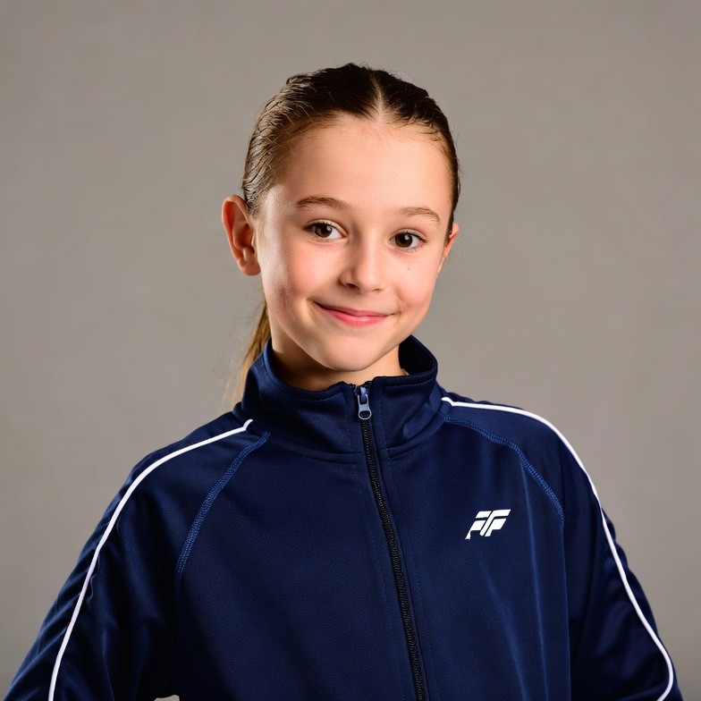A young girl with light brown hair in a ponytail smiles at the camera against a gray background. She wears a navy blue zip-up tracksuit with white piping and a PF logo on the chest. Her expression is cheerful with bright eyes and a gentle smile.
