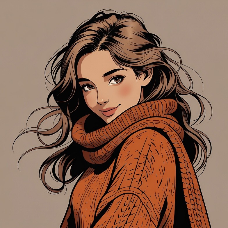 A young woman with long wavy brown hair smiles gently while wearing a thick orange knit scarf. Her face features soft blush on the cheeks and expressive eyes. The illustration is set against a plain beige background.
