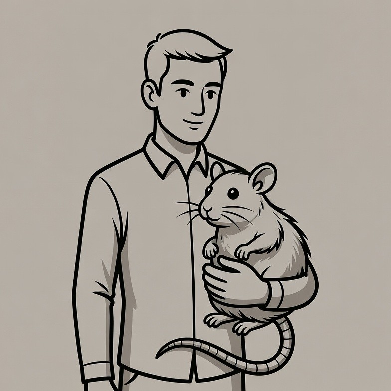 A cartoon illustration depicts a young man with short hair wearing a collared shirt, gently holding a small rat in his hands. The rat has large eyes, whiskers, and fluffy fur, standing on its hind legs. Both are outlined in black on a plain beige background.