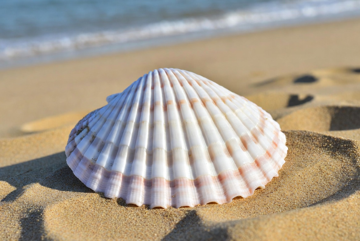 beach, golden sand, isolated background, marine, nature, ocean, pink ridges, sand, seashell, seashore, shell, shore, waves, white shell, scallop shell