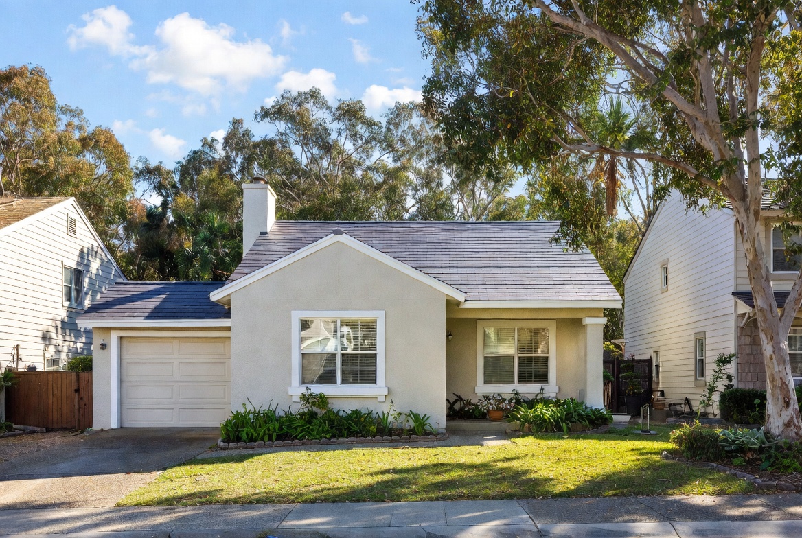 architecture, beige house, blue sky, clouds, craftsman style, driveway, eucalyptus trees, exterior, fence, flowers, garage, grass, home, landscaping, lawn, neighborhood, palm trees, plants, real estate, roof, shingles, suburban house, trees, windows, house