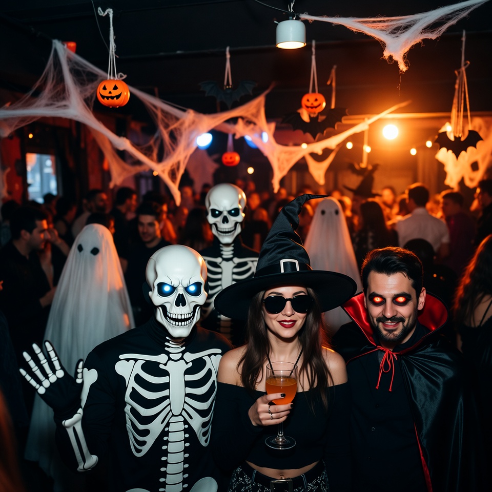 Multiracial, White, adults, cape, celebration, cobwebs, costumes, crowd, dark venue, drink, female, festive, ghost, group, jack-o-lanterns, male, man, nightclub, orange lights, party, skeleton, skull mask, spooky, sunglasses, vampire, witch, woman, Halloween party
