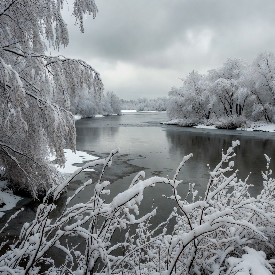 A serene winter landscape features a frozen river bordered by trees heavy with snow. Bare branches covered in frost frame the calm, icy water under a cloudy gray sky. Snow dusts the ground and edges of the riverbank.