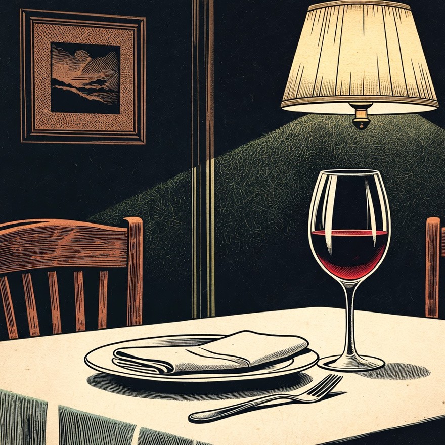A detailed illustration shows a wine glass filled with red wine placed on a white tablecloth in a dimly lit room. Wooden chairs flank the table, with a folded white napkin and plate nearby, along with a fork and knife. A shaded lamp casts light from above, and a framed landscape hangs on the dark wall.