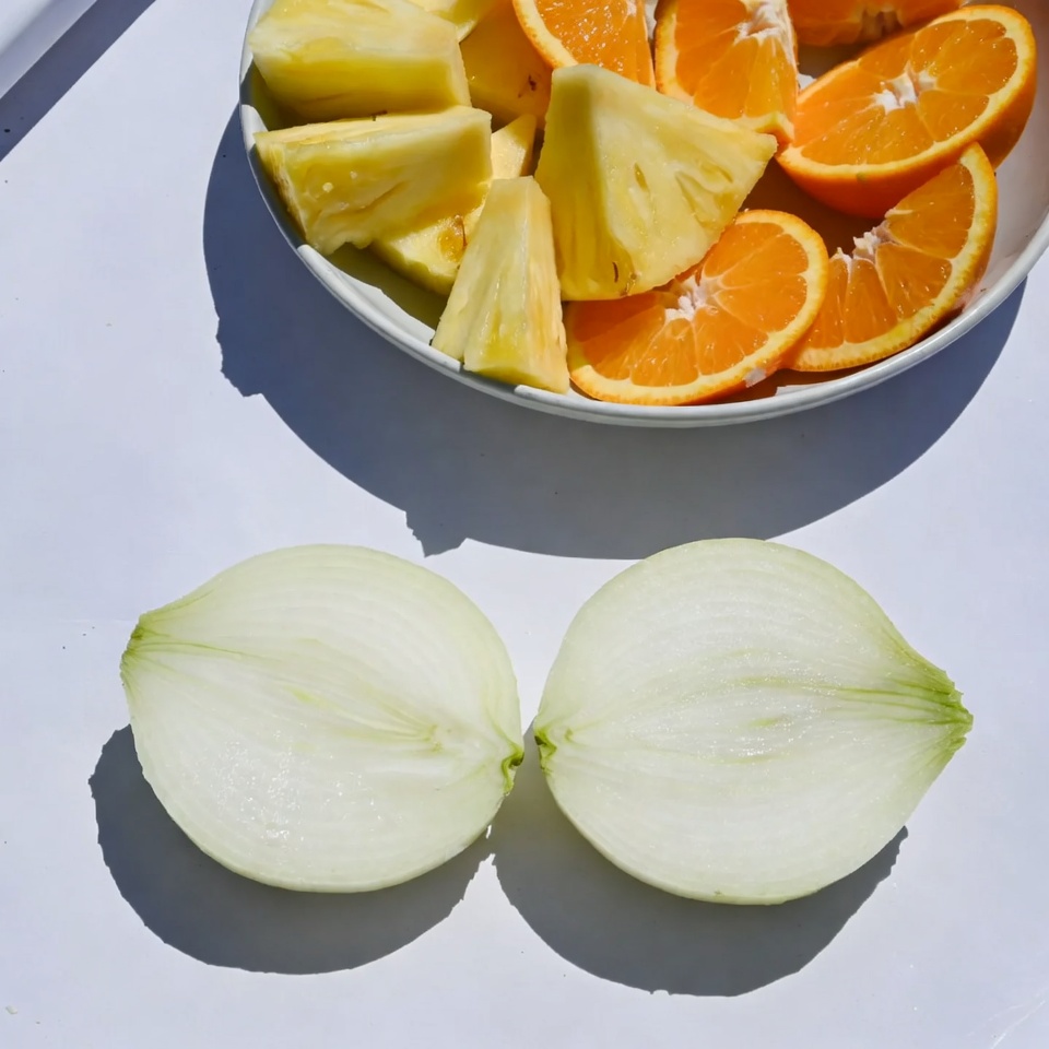 A white bowl on a white surface holds chunks of fresh yellow pineapple and sliced oranges. Below the bowl, two white onions are sliced in half and placed side by side. The fruits and vegetables are brightly colored against the plain background.