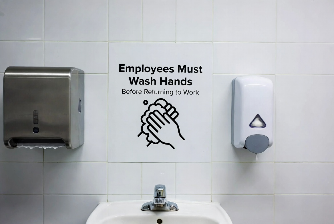 A bathroom sign on white tiled wall reads 'Employees Must Wash Hands Before Returning to Work'. It features a black line drawing of hands being washed with soap. Nearby are a stainless steel paper towel dispenser, white soap dispenser, and white sink.