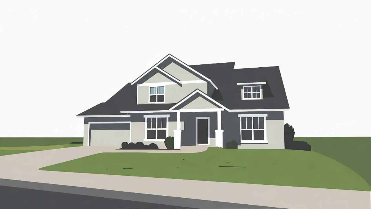 A flat illustration of a two-story gray house features a dark sloped roof, multiple windows, and a front porch with white columns. A two-car garage is attached on the left side, with shrubs planted nearby. The house sits on a green lawn with a curved concrete driveway, all on an isolated white background.
