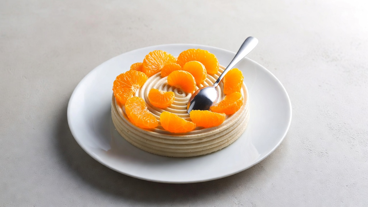 cream frosting, dessert, food, fruit topping, gourmet dessert, isolated background, mandarin orange, orange segments, pastry, silver spoon, tangerine, white plate, cake