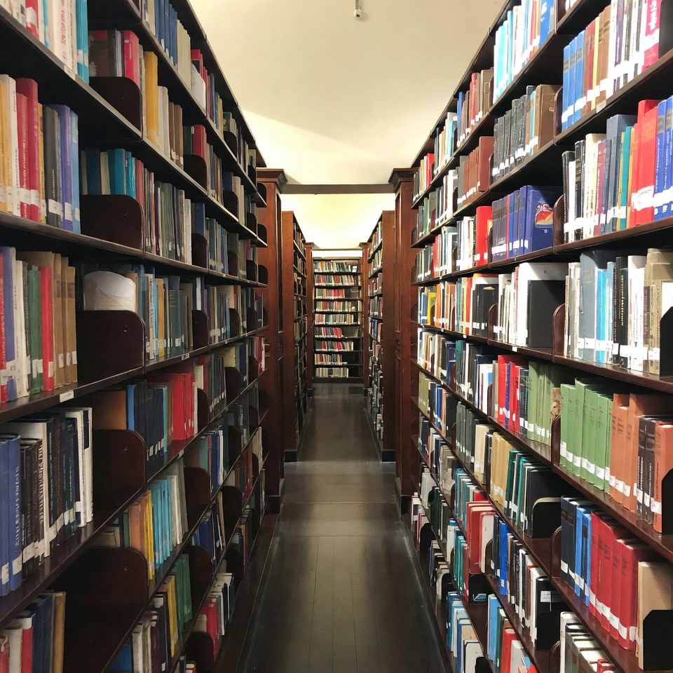 academic, aisle, architecture, book collection, book rows, books, books, books stacked, bookshelves, colorful spines, empty hallway, indoor, knowledge, library interior, library stacks, literature, narrow path, quiet space, reading room, shelves lined, study area, tall shelves, wooden floor, wooden shelves, library